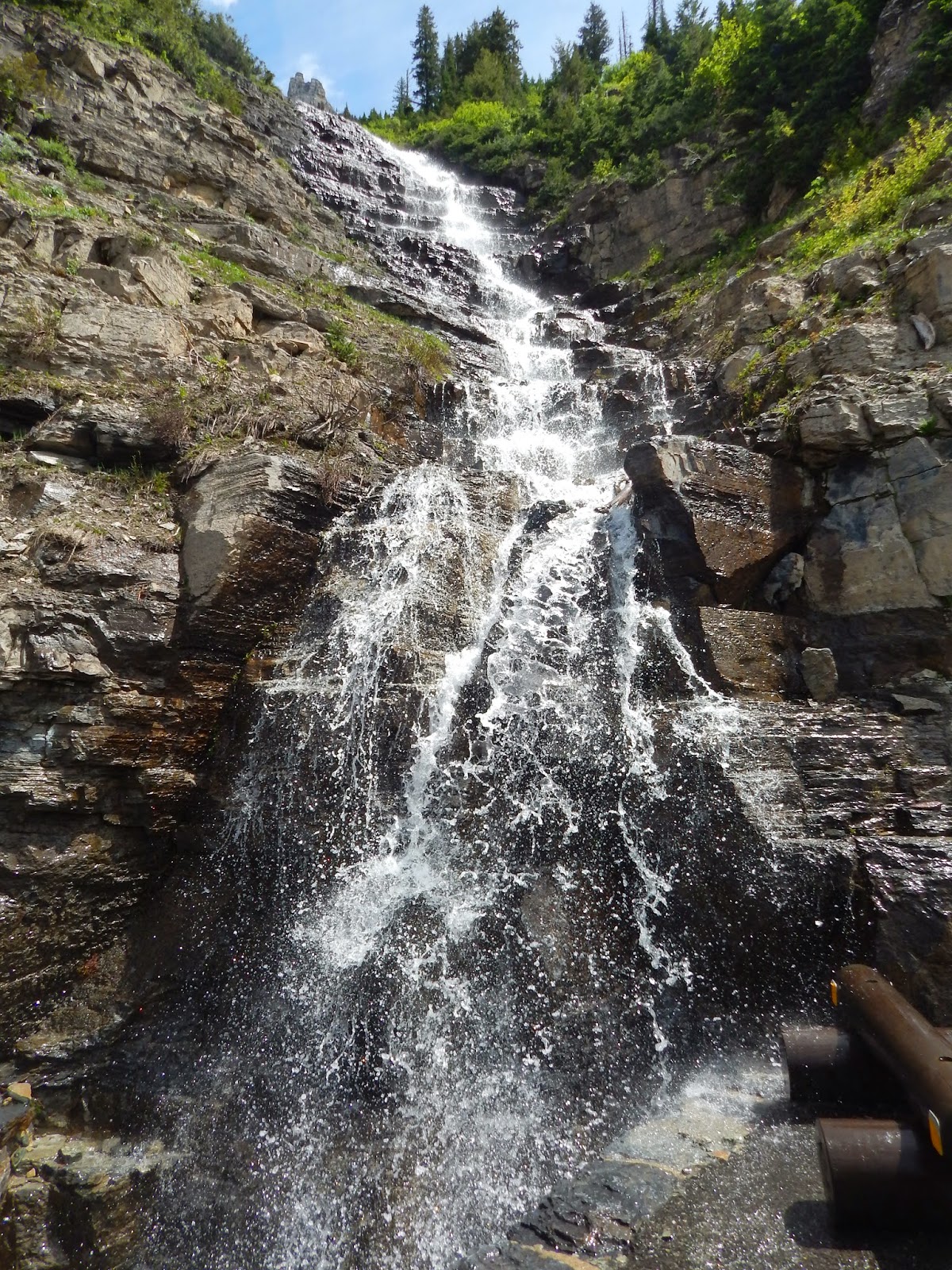 As you're driving down the going-to- the-sun Road, there are literally dozens of waterfalls coming down all over the place. Pictures can't do it justice.