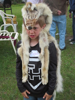 After we arrived in the boys ran around and played until well after their bedtime, Logan burst into tears and said we are not going to get to see all of the animal skins. The next thing you know, I turned around and Logan was wearing the coyote skin that Bob had killed.